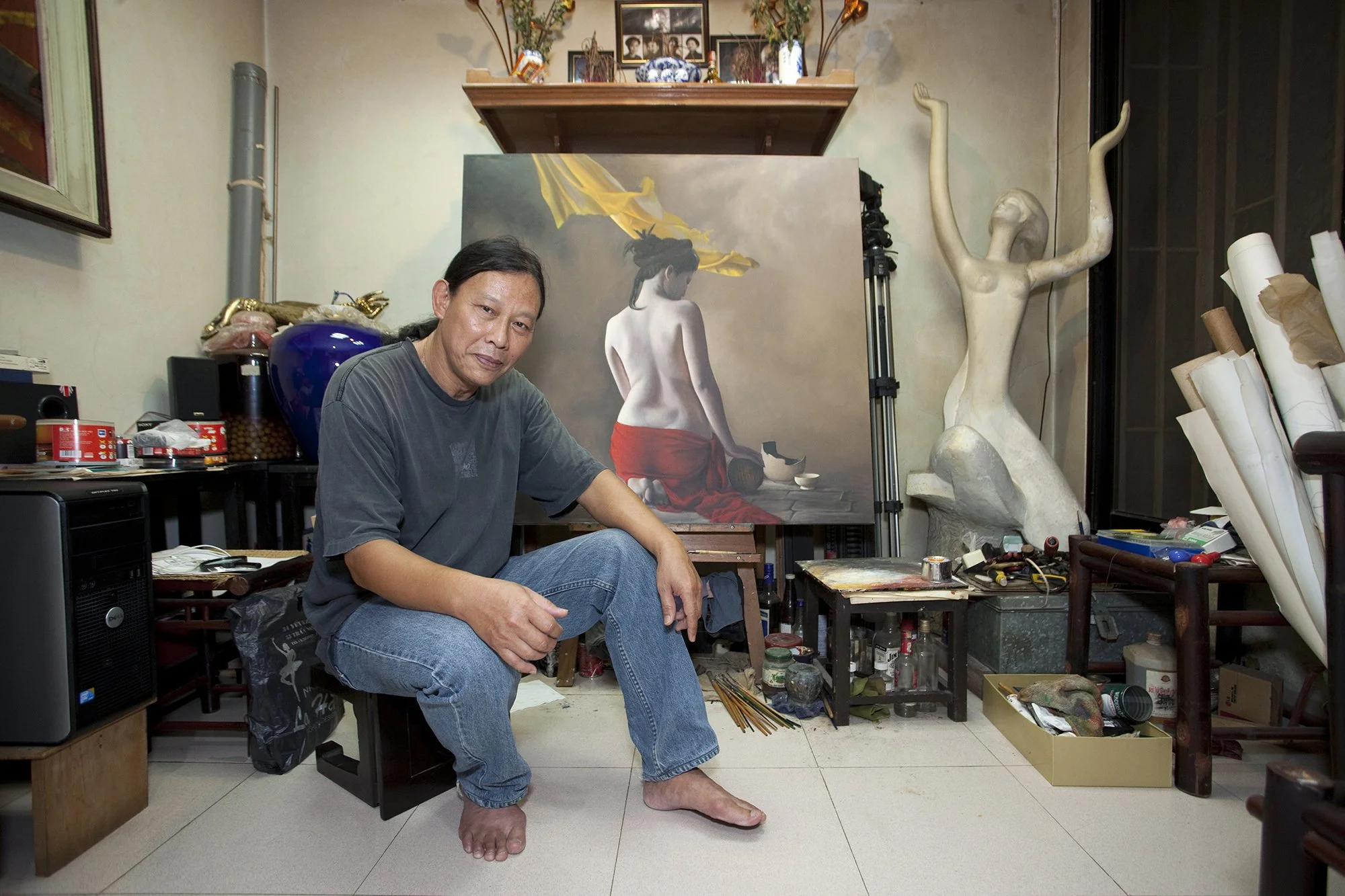 Let’s start with Chau Pham (above), he is a fine art painter and designer. Pham has a small studio inside his apartment in Hanoi, which he has occupied for over 15 years. Occasionally he is selling his paintings trough a gallery. However, he explains that he finds it difficult to make a living from art alone, therefore he supplements his income by teaching art at a local school.
